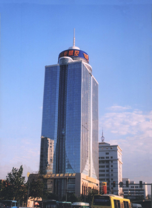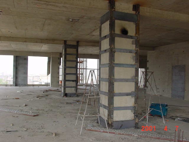 山東航空公司大廈部分框架柱采用包角鋼加固處理。