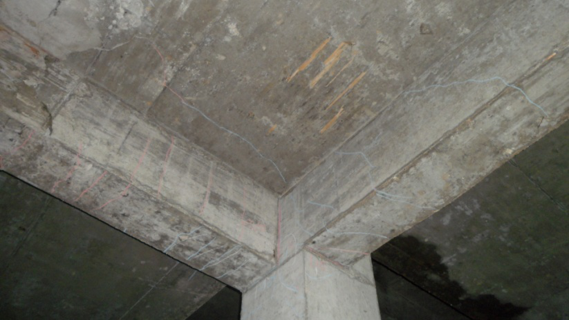 我所技術(shù)人員于2013年7月赴現(xiàn)場進行了檢測,檢測結(jié)果表明,車庫中心位置上浮位移值最大,上浮后柱底最大高層超過20cm??蚣苤谏细∥灰飘a(chǎn)生的附加軸力及附加彎矩的作用下,產(chǎn)生了開裂及壓碎現(xiàn)象(圖3、圖4)??蚣芰憾藗?cè)面部出現(xiàn)了剪切斜裂縫、梁端底部出現(xiàn)水平裂縫(圖5),特別是車庫與高層住宅交界位置,梁端開裂較為明顯。在車庫頂梁板與車庫外周擋土墻交界位置處附加彎矩的作用下,除梁端裂縫外,擋土墻在梁底標高以下位置出現(xiàn)通長水平裂縫。沿車庫平面跨中位置車庫平面縱向,車庫頂板出現(xiàn)兩條通長裂縫;車庫入口處沿車庫平面橫向,車庫頂板同樣出現(xiàn)兩條通長裂縫,頂板裂縫均與上浮位移較大軸線相對應。