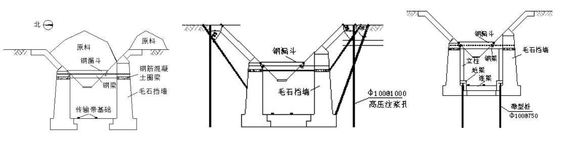 在地下通廊結(jié)構(gòu)中,鋼漏斗內(nèi)鐵礦原料通過鋼梁對毛石擋墻施加豎向力。由于鋼漏斗內(nèi)原料高度經(jīng)常大于設(shè)計(jì)高度,使得毛石墻受到來自鋼漏斗較大的恕向壓力,造成毛石墻的基礎(chǔ)下沉,為了避免毛石墻基礎(chǔ)進(jìn)一步下沉,需要對其進(jìn)行加固處理。地下通廊皮帶槽與毛石墻體之間的最大距離約1.5m,最小距離0.5m,機(jī)械設(shè)備無法進(jìn)行施工,同時(shí)整個(gè)加固施工期間不能影響生產(chǎn)的正常運(yùn)行,經(jīng)過多方論證,決定采用人工成孔的微型樁(樹根樁)對毛石擋墻基礎(chǔ)進(jìn)行托換處理。通過增加的鋼筋混凝土立柱、地梁和微型樁組成的豎向受力體系分擔(dān)來自鋼梁的壓力(圖7),減小毛石擋墻所受的豎向力,從而減小其沉降。