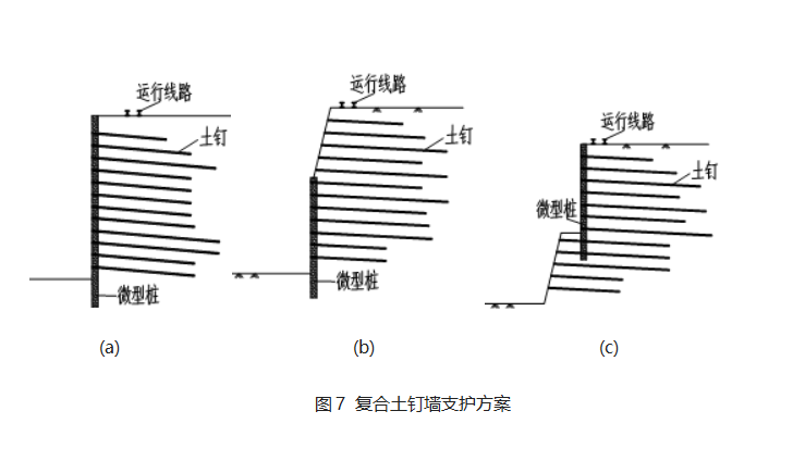 (3)方案三:考慮到以上方案的優(yōu)缺點,我單位提出基坑上部采用微型樁+土釘錨桿的擋土墻形式,下部采用傳統(tǒng)土釘墻形式(圖3c),該方案得到建設(shè)單位和監(jiān)理單位的認可,并獲得實施。該方案