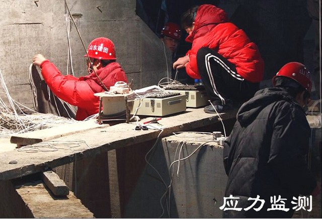 在平移施工前及平移施工過程中,隨時監(jiān)測托換梁的應(yīng)力及整個建筑物的沉降、傾斜、振動情況等。