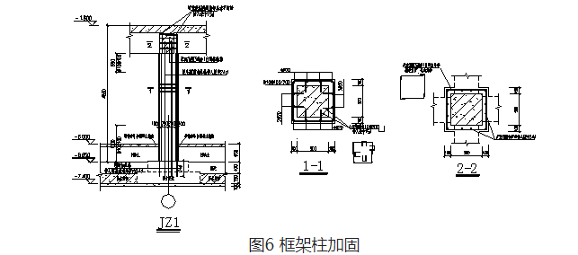 現(xiàn)場檢測發(fā)現(xiàn),車庫上浮導(dǎo)致柱開裂且絕大部分柱產(chǎn)生了受壓區(qū)混凝土壓碎現(xiàn)象,柱發(fā)生受壓破壞,故采用加大截面方法對車庫內(nèi)55棵框架柱進行加固。原柱每邊外擴10cm,增設(shè)豎向鋼筋及箍筋,采用高強免振搗灌漿料澆筑,見圖6。