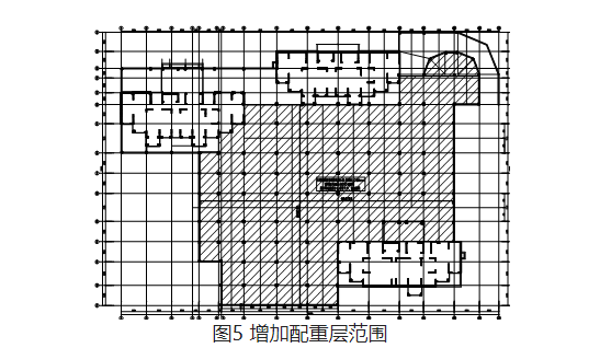根據(jù)建筑完工后總平面中的場地最低點,抗浮設(shè)計水頭按4.5m對車庫部分結(jié)構(gòu)進行復(fù)核驗算,復(fù)核驗算內(nèi)容包括整體抗浮計算和局部抗浮計算。結(jié)合驗算結(jié)果及現(xiàn)場檢測情況,在車庫現(xiàn)有地面上增設(shè)20cm厚混凝土層,如圖5中陰影所示。
