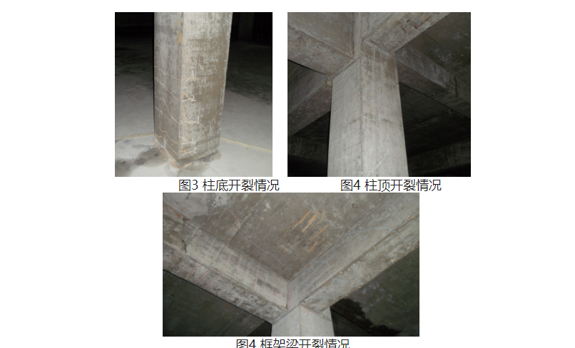 我院技術(shù)人員于2013年7月赴現(xiàn)場進行了檢測,檢測結(jié)果表明,車庫中心位置上浮位移值最大,上浮后柱底最大高層超過20cm??蚣苤谏细∥灰飘a(chǎn)生的附加軸力及附加彎矩的作用下,產(chǎn)生了開裂及壓碎現(xiàn)象(圖3、圖4)??蚣芰憾藗?cè)面部出現(xiàn)了剪切斜裂縫、梁端底部出現(xiàn)水平裂縫(圖5),特別是車庫與高層住宅交界位置,梁端開裂較為明顯。在車庫頂梁板與車庫外周擋土墻交界位置處附加彎矩的作用下,除梁端裂縫外,擋土墻在梁底標(biāo)高以下位置出現(xiàn)通長水平裂縫。沿車庫平面跨中位置車庫平面縱向,車庫頂板出現(xiàn)兩條通長裂縫;車庫入口處沿車庫平面橫向,車庫頂板同樣出現(xiàn)兩條通長裂縫,頂板裂縫均與上浮位移較大軸線相對應(yīng)。