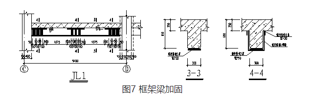 車庫頂梁破壞情況較輕,灌縫后采用粘貼碳纖維加固方法加固,對產(chǎn)生斜裂縫的梁在梁端增設(shè)碳纖維U形箍加固,對梁底出現(xiàn)受拉裂縫的梁在梁底粘貼碳纖維加固,見圖7。