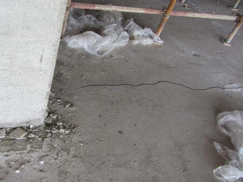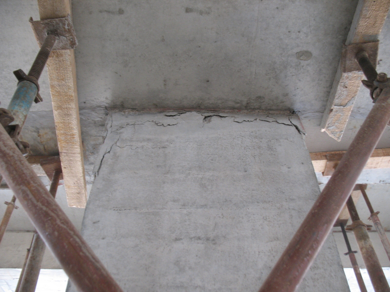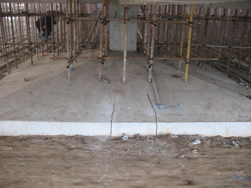 主體結(jié)構(gòu)現(xiàn)已封頂,在2014年元旦左右,拆除E區(qū)一二層頂BDF大板模板后,發(fā)現(xiàn)一層~三層頂大板四周柱與相關(guān)梁出現(xiàn)不同程度的裂縫,隨之二層頂BDF大板也出現(xiàn)板底裂縫。